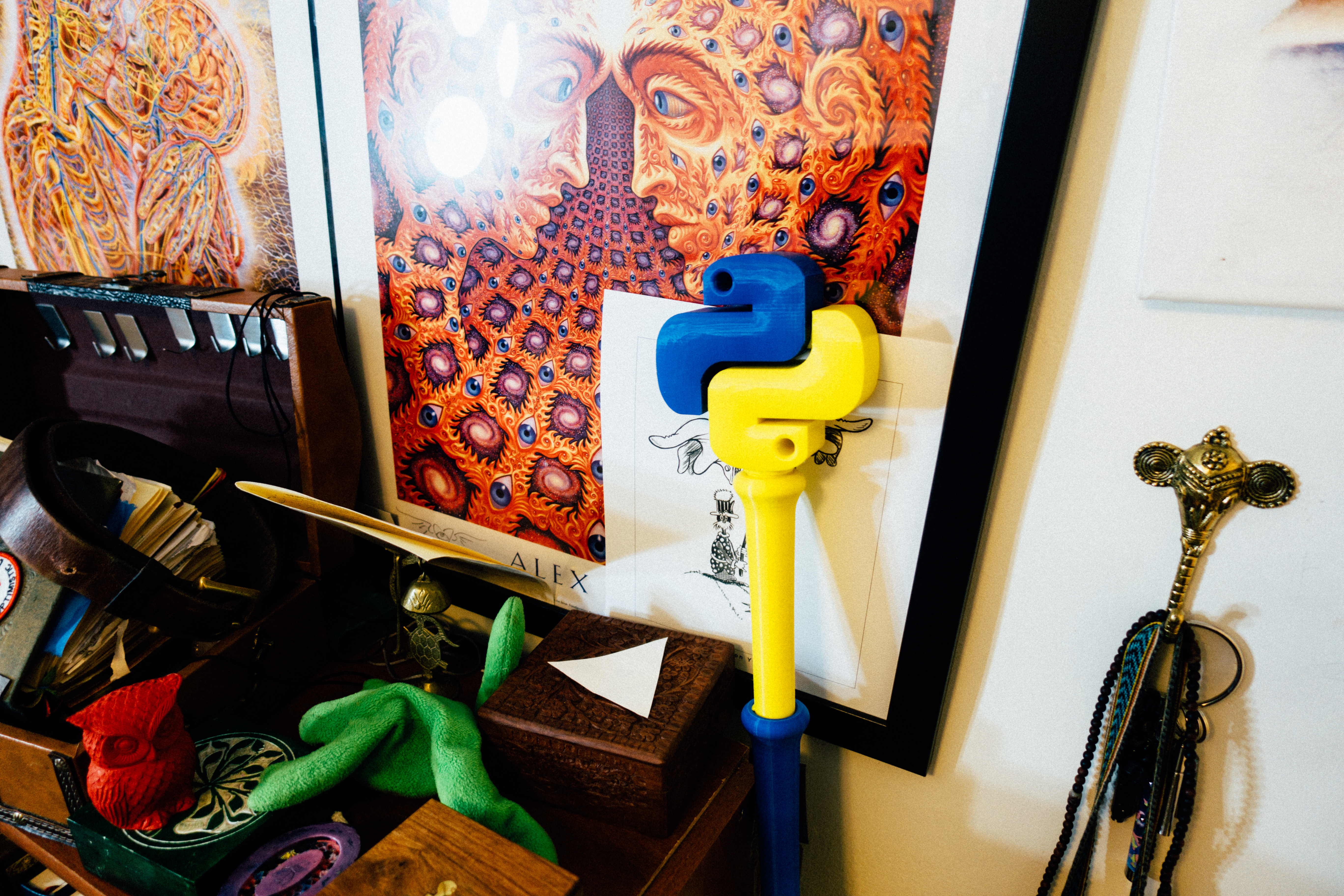 This photograph captures a vibrant corner of a creative space, filled with eclectic objects and intriguing artwork. The bright yellow and blue shapes in the foreground contrast with the intricate, psychedelic patterns of the artwork behind, creating a lively interplay of color and form. Soft, diffused lighting adds a warmth to the scene, enhancing the sense of wonder and exploration.