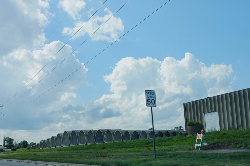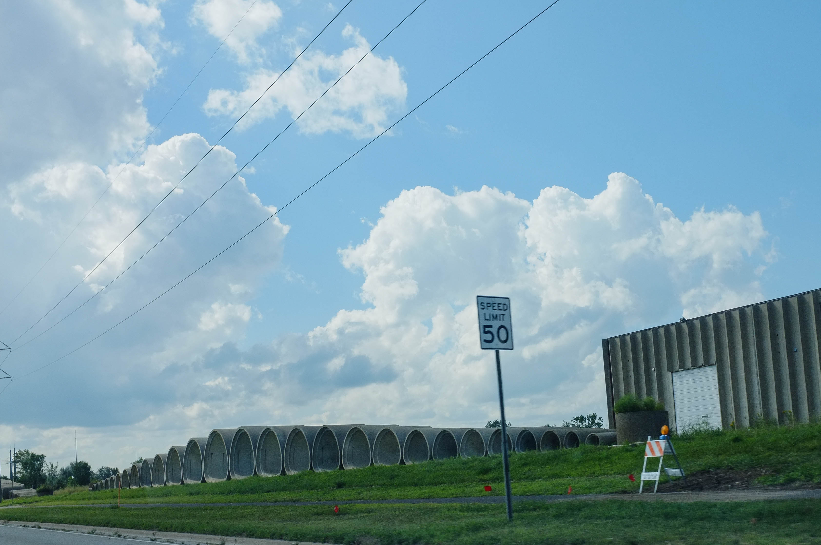 The photograph captures a vast, open sky dotted with puffy clouds, creating a serene yet slightly imposing atmosphere over an industrial landscape. Large concrete pipes stretch along the roadside, framed by a neatly manicured green lawn and a speed limit sign, suggesting a tension between nature and urban development. The soft lighting enhances the subtle textures of the cloud formations and the weathered surfaces of the buildings, evoking a sense of calm amidst the structures of industry.