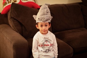 In a cozy indoor setting, a young boy sits on a brown couch wearing a playful shark hat that adds whimsy to the scene. The soft, warm lighting enhances the relaxed atmosphere, highlighting his curious expression and inviting a sense of innocence and joy. With holiday decor subtly in the background, the image captures a moment of simple childhood delight.