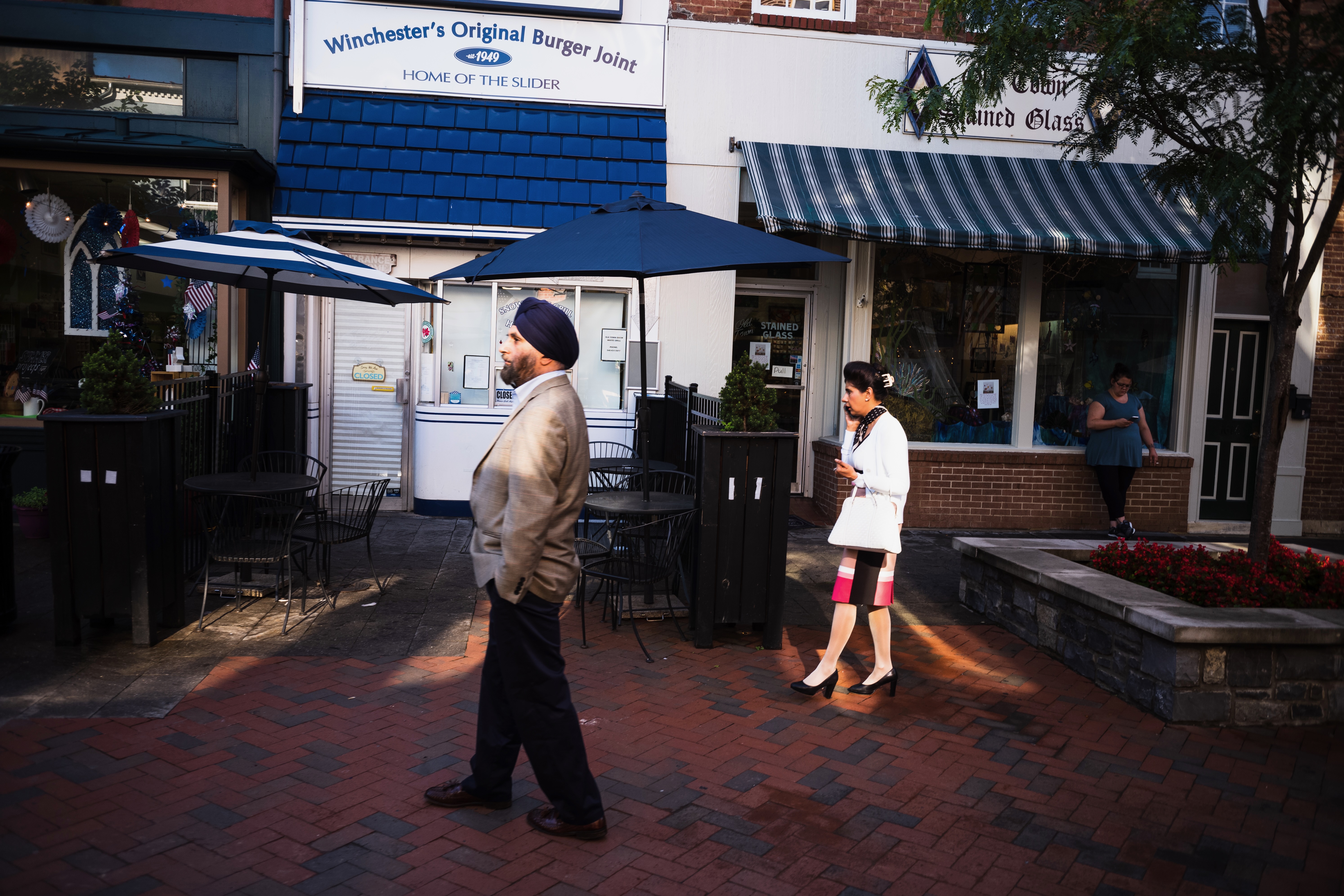 In a lively street scene, a man in a suit walks purposefully, while a woman checks her phone behind him, creating a dynamic but relaxed atmosphere. The composition highlights a charming mix of urban life, with colorful storefronts and inviting outdoor seating dotted with blue umbrellas. Sunlight casts gentle shadows, enhancing the day's warmth and the vibrant details of the surroundings.