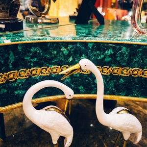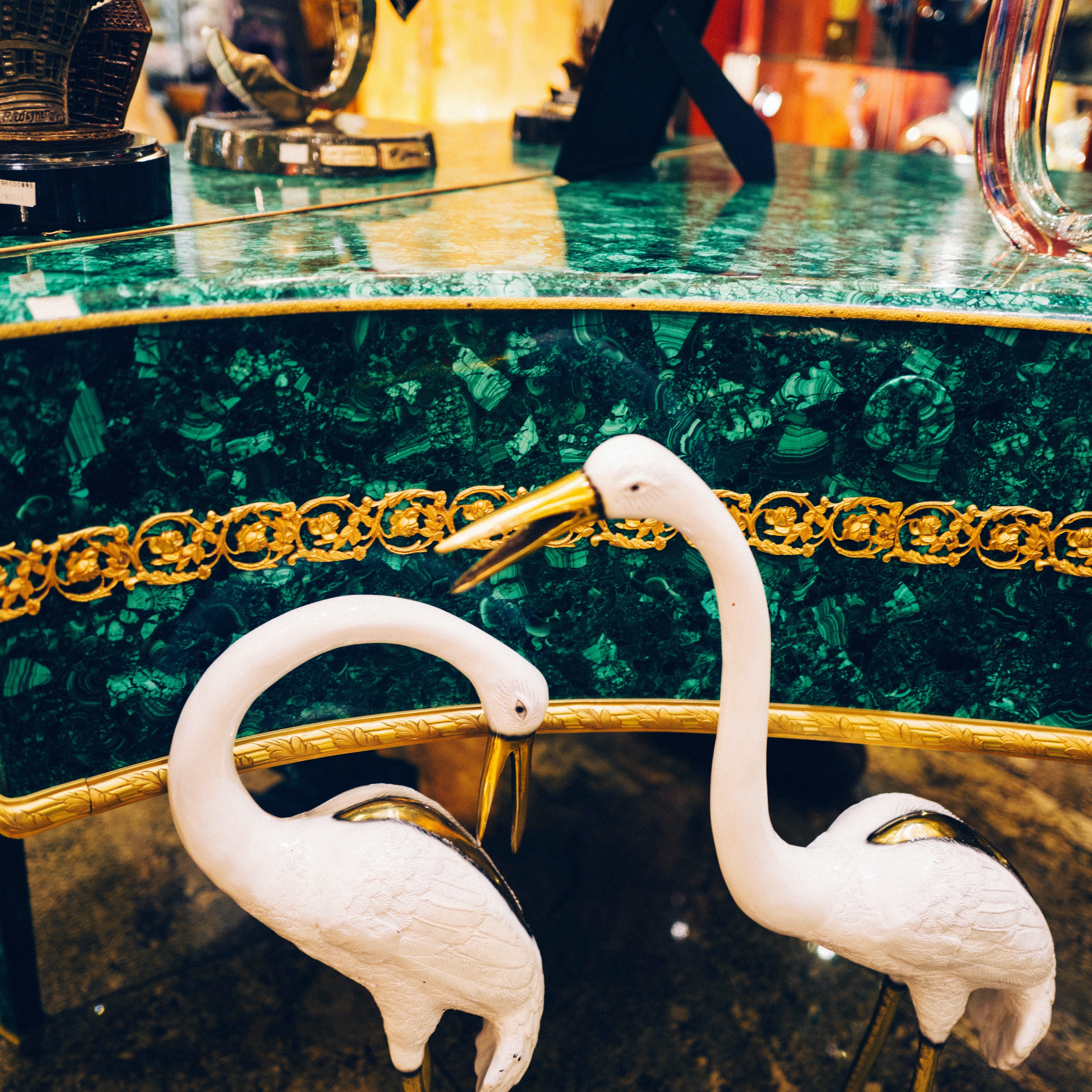 A pair of intricately designed white crane figurines stand gracefully against a backdrop of a striking malachite-patterned tabletop adorned with golden accents. The warm, ambient lighting casts a soft glow, enhancing the mood of quiet sophistication and charm. The composition draws the eye towards the delicate details of the figurines, creating a sense of harmony and timeless beauty in an eclectic space.