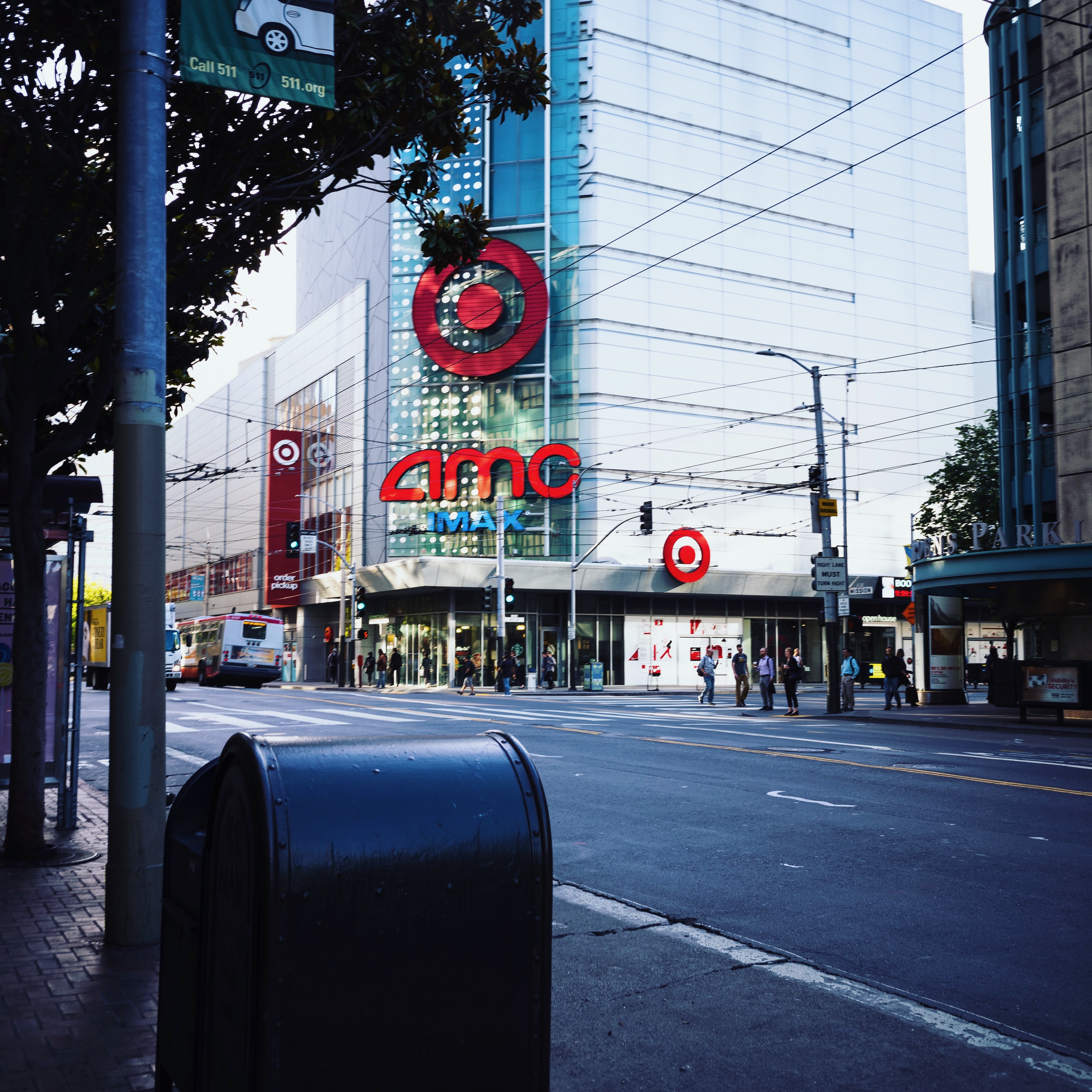 A vibrant city scene featuring the bright red AMC marquee, capturing the energetic pulse of urban life. The glass facade reflects the morning light, enhancing a sense of modernity, while pedestrians casually traverse the street, suggesting a lively but relaxed atmosphere. The cool tones of the sky contrast with the vivid colors of the signage, creating an engaging visual focal point.