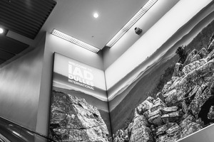 The photograph captures a dramatic black-and-white mural at Dulles International Airport, featuring rugged rocks and rolling hills that invite travelers into the region's natural beauty. The upward angle emphasizes the height of the mural and the clean lines of the ceiling, creating a sense of openness and modernity. Soft lighting adds depth to the scene, enhancing the textures of the rocks and contributing to a serene yet striking atmosphere.