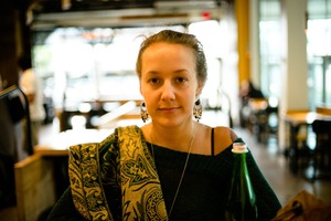 The photograph captures a young woman sitting in a café, her expression calm and contemplative as she gazes directly at the camera. Soft, natural light streams in from large windows, enhancing the warm ambiance of the space, while her intricate scarf and bold earrings add a touch of character to her laid-back yet intentional look.