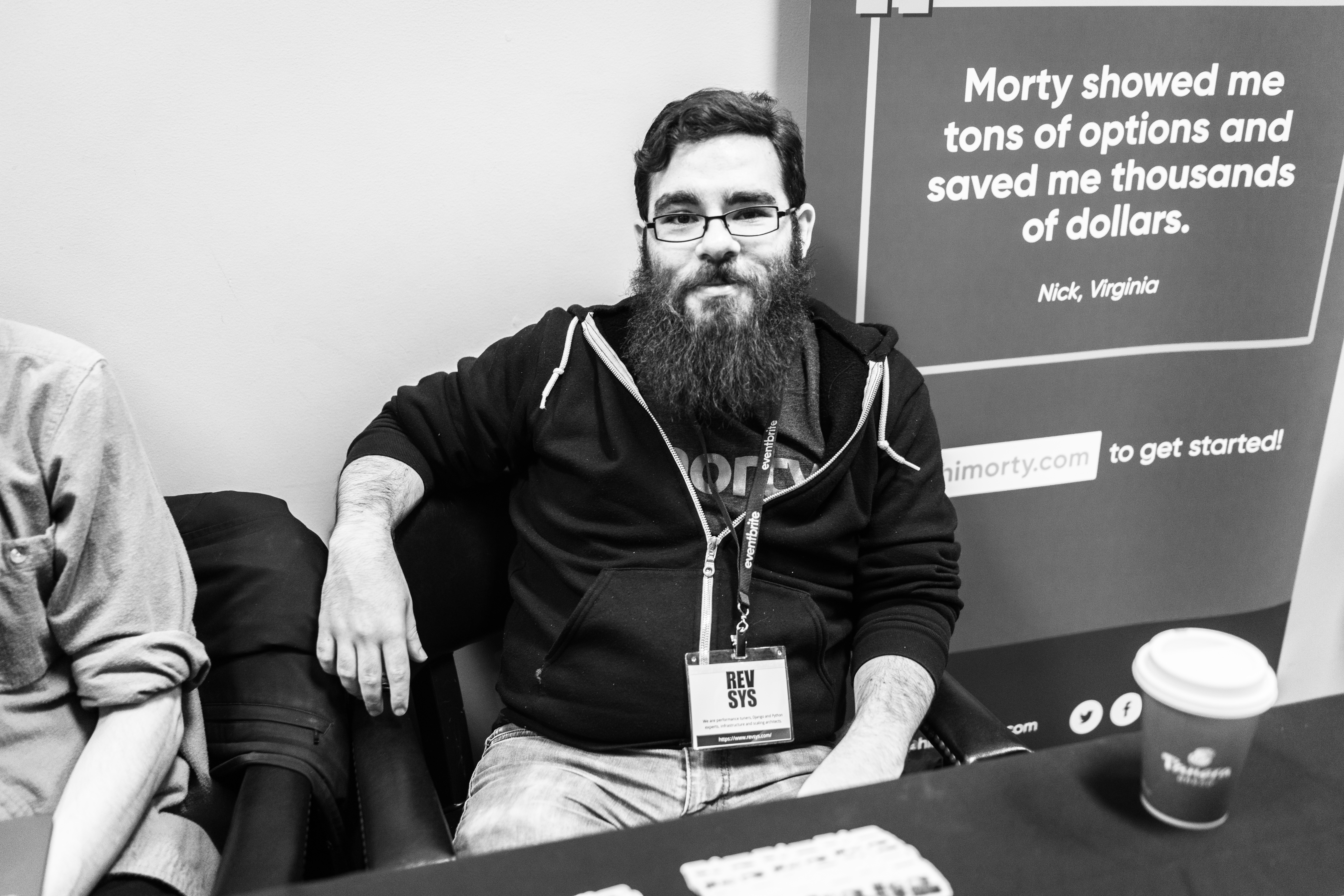 A bearded man sits comfortably at a table, exuding a relaxed yet engaging demeanor. The black-and-white composition highlights his thoughtful expression against a backdrop of marketing materials, creating a professional yet approachable atmosphere. Soft lighting enhances the friendly mood, inviting viewers to connect with his story.