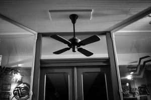 A ceiling fan hangs centrally over a glass doorway, capturing the stillness of a dimly lit space. The black and white tones evoke a nostalgic mood, while the soft lighting adds depth and intrigue to the shadows. The composition draws the eye upward, inviting contemplation of the simple yet essential elements of everyday life.