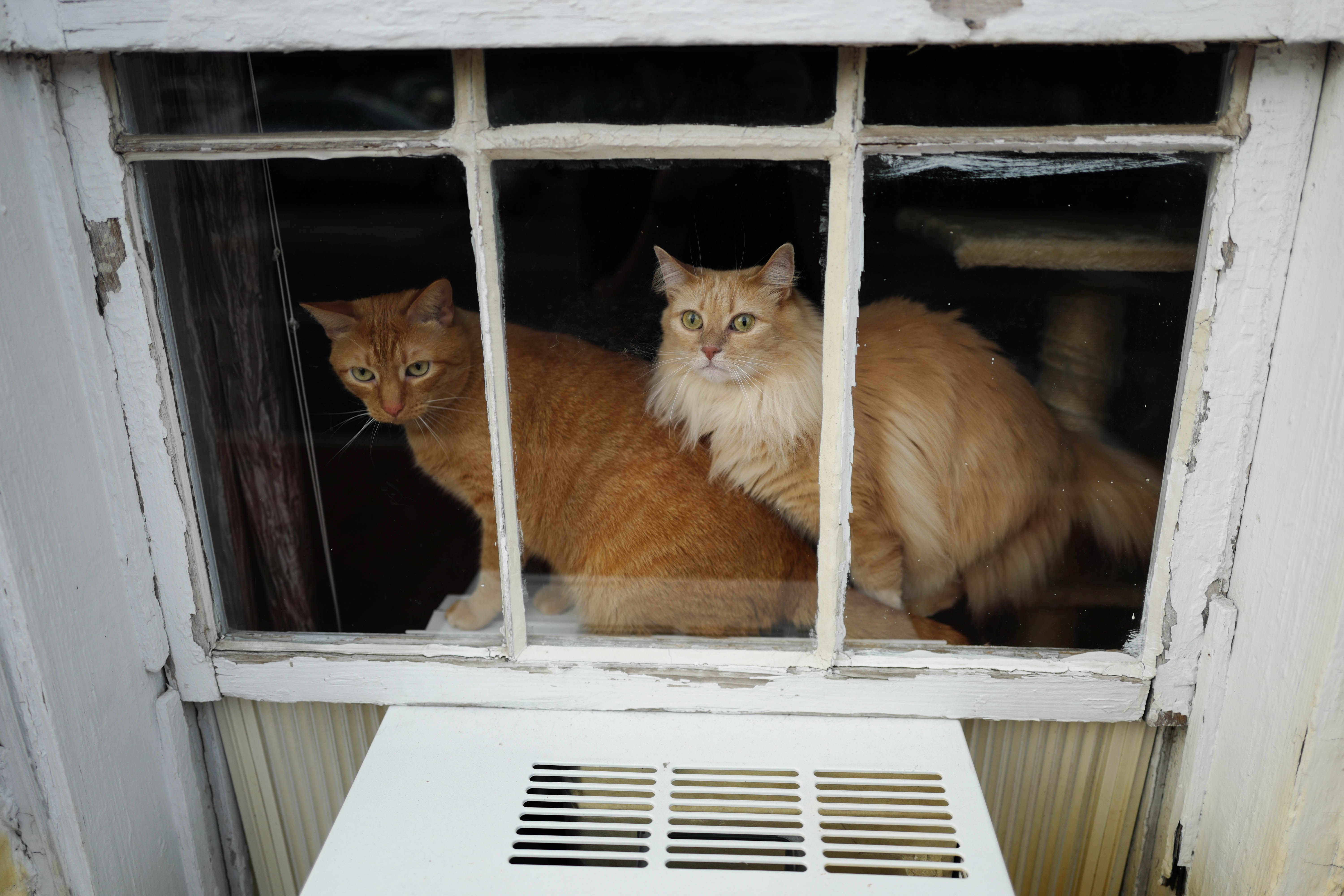 Two orange cats peer out from behind a weathered window, their expressions a blend of curiosity and intrigue. The soft, natural light casts a warm glow, enhancing the inviting yet mysterious ambiance. The contrast of the rustic frame and the sleek glass adds depth, drawing the viewer into the intimate moment shared between the feline companions.