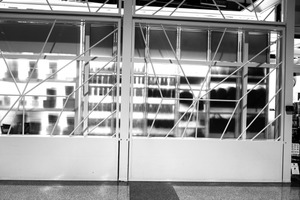 This striking black-and-white photograph features a large window divided by intersecting metal beams, creating an intricate geometric pattern. The reflective surfaces hint at movement and life just beyond the glass, contrasting the stillness of the foreground. A blend of light and shadow evokes a mood of ambiguity, suggesting both confinement and openness within the urban environment.