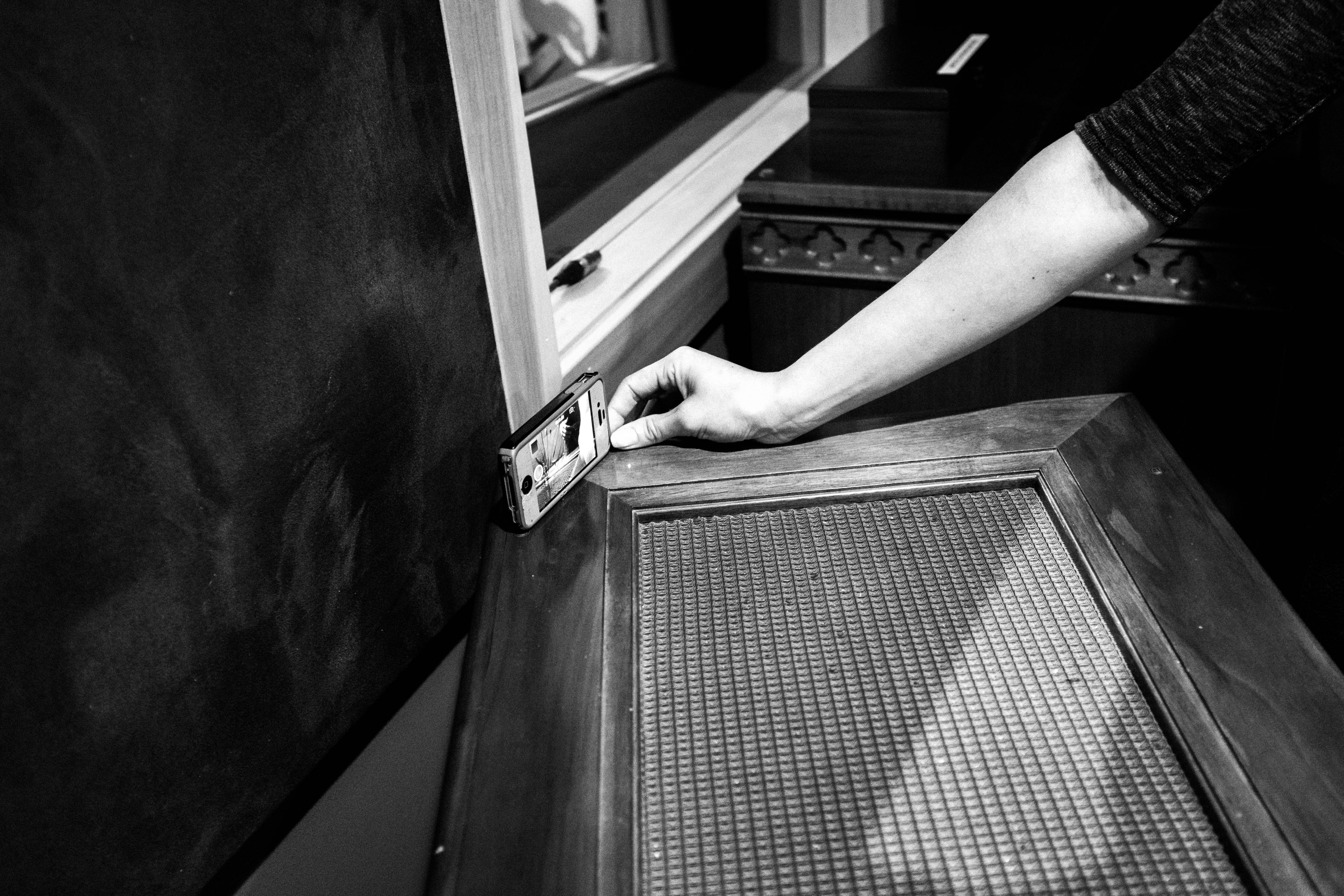 The photograph captures a hand reaching for a mobile phone placed at an intriguing angle on a wooden table. The monochromatic tones amplify the mood of contemplation and intimacy, drawing focus to the simple yet poignant act of connection. Soft lighting highlights the textures of the surfaces, enhancing the sense of quiet urgency in the scene.