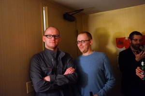 In a dimly lit room, two men stand near a doorway, their expressions reflecting a blend of contemplation and amusement. The warm, soft light casts gentle shadows, creating an intimate atmosphere that contrasts the lively background of a social gathering. The juxtaposition of their serious stances with a hint of a smile from the man on the right adds an intriguing layer to the scene.