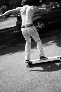 Captured in striking black and white, this photograph depicts a young man effortlessly balancing on a skateboard in a moment of pure motion. The play of light and shadows emphasizes his athletic form as he glides across the pavement, embodying a carefree spirit of summer. Surrounding greenery hints at a vibrant day, contrasting beautifully with the stillness of the urban backdrop.