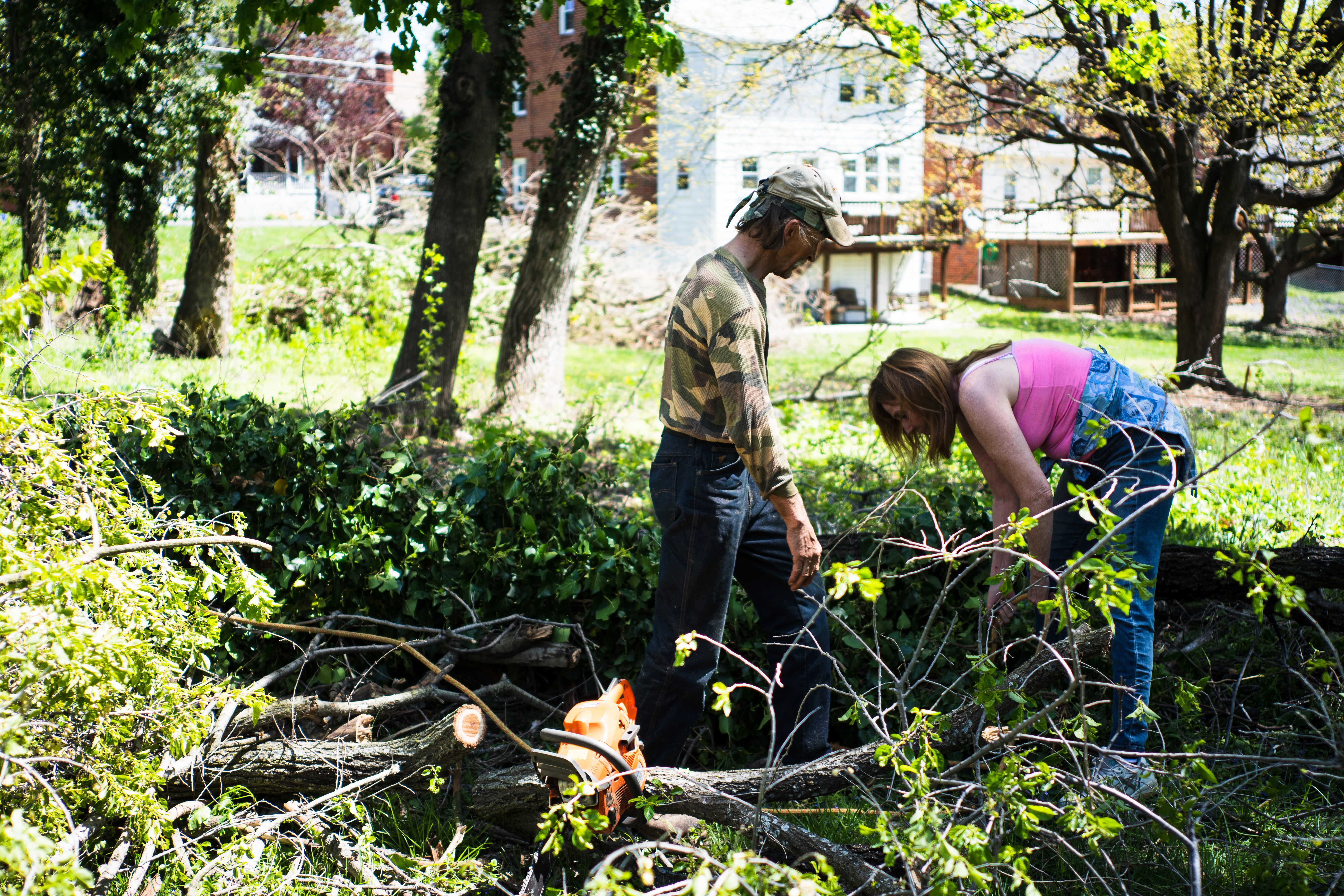 In a sun-drenched yard, two individuals are deeply engaged in clearing fallen branches, surrounded by a lush canopy of greenery. The composition captures a moment of collaboration, with the man in a camo shirt and the woman in bright overalls focused on their task. The warm, vibrant lighting enhances the earthy tones, creating a sense of renewal and community spirit.