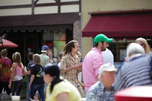 In this bustling outdoor scene, a young man with dreadlocks stands amidst a crowd, holding a drink and absorbed in conversation. The warm sunlight casts vibrant highlights on the faces around him, contributing to a cheerful and lively atmosphere. The composition draws the eye to the subject while also capturing the energy of a community gathering, with colorful clothing and lively interactions creating a sense of summer joy.