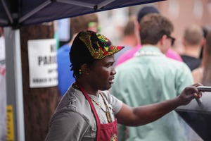 A focused vendor stirs over a grill, embodying the vibrant atmosphere of a bustling food market. The rich colors of his hat and apron contrast with the soft, blurred backgrounds of enthusiastic customers, creating a lively yet intimate mood. Natural light enhances the textures and details, highlighting his concentration amidst the surrounding commotion.