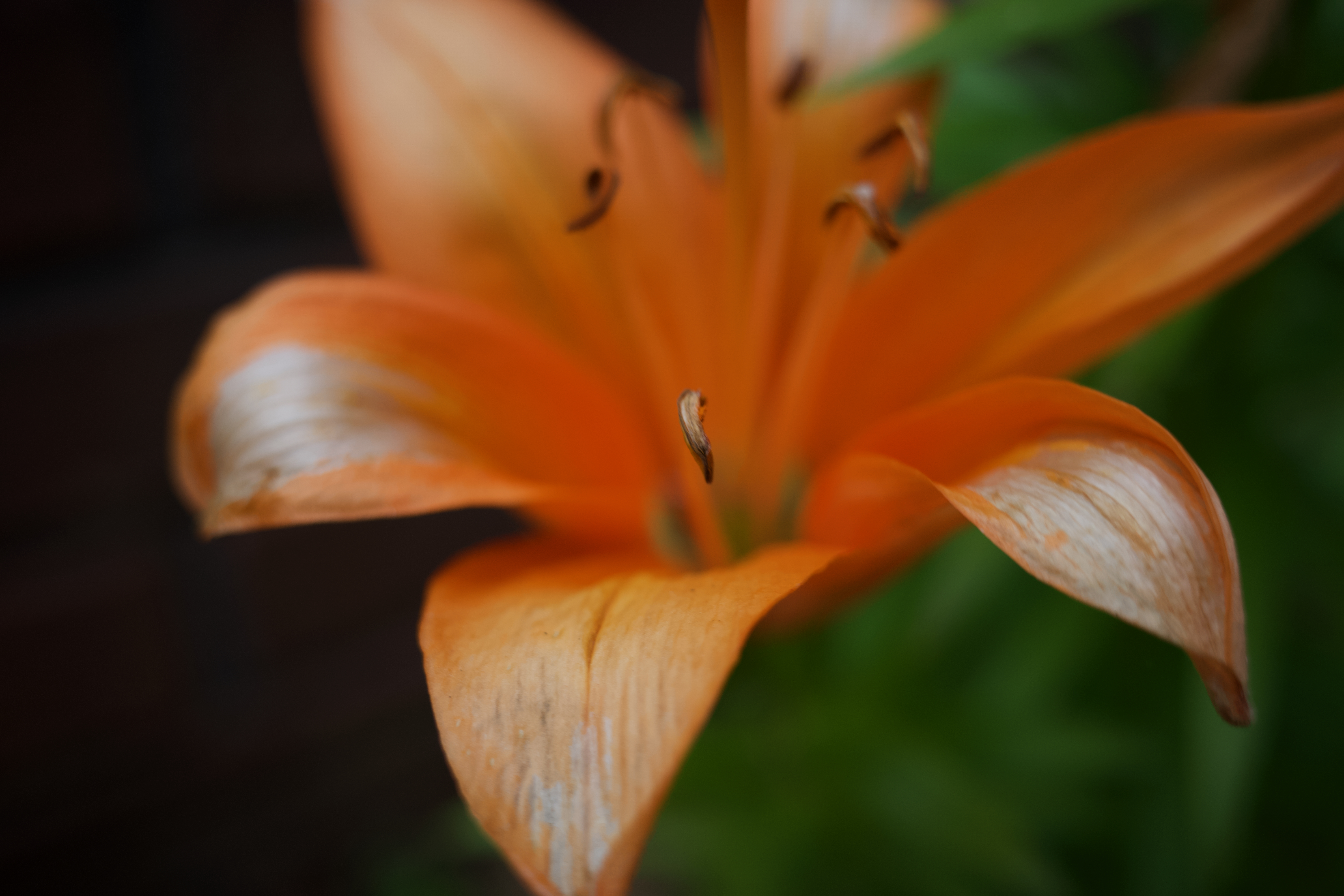 This close-up photograph captures the delicate beauty of an orange lily, its velvety petals unfurling gracefully against a dark, contrasting background. The soft natural lighting enhances the flower's rich hues, while a shallow depth of field draws focus to the intricate details of the petals and stamens, creating a sense of intimacy and tranquility.