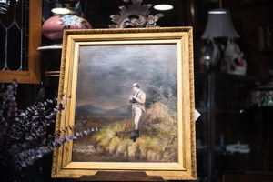 A vintage painting, framed in ornate gold, depicts a solitary figure in the serene embrace of nature, pondering with a shovel in hand. Soft, muted lighting casts a nostalgic glow, enhancing the moody palette of greens and browns. The contrasting backdrop of a glass cabinet filled with trinkets adds depth, drawing the viewer into a world suspended between time and memory.
