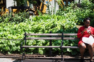 The photograph captures a woman in a vibrant red dress seated on a park bench, engrossed in her phone while surrounded by lush greenery. The bright sunlight creates a cheerful and relaxed atmosphere, contrasting with the busy construction equipment blurred in the background. This moment of solitude amid the urban hustle conveys a sense of peace and introspection.
