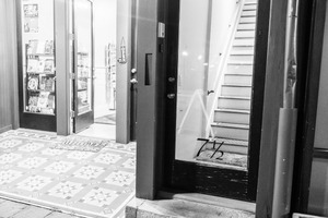 This black-and-white photograph captures an inviting entrance framed by open doors, with a tiled floor pattern extending a warm invitation through the lens. The lighting is soft yet illuminating, casting gentle shadows and creating a sense of depth, leading the viewer's gaze toward the cascading stairs in the background. The overall mood is nostalgic and welcoming, evoking a sense of curiosity about what lies beyond the threshold.