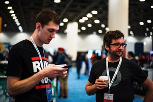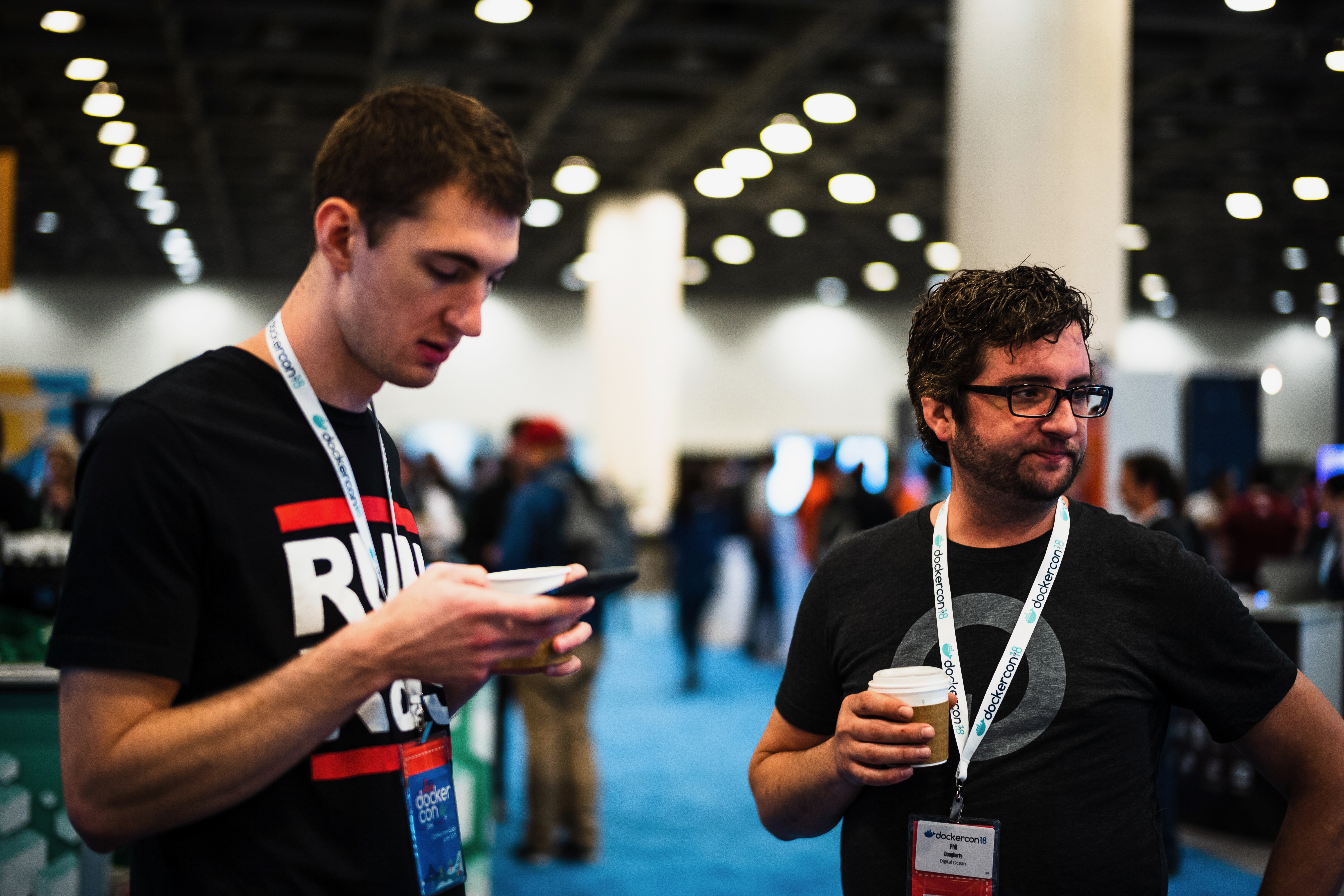 In a bustling convention space, two young men stand engaged in their own worlds amidst the crowd. One is focused on his phone while the other, holding a coffee, gazes thoughtfully off to the side, their relaxed postures contrasting with the energetic atmosphere around them. The soft, diffused lighting highlights the friendly, informal vibe, producing an inviting warmth in the scene.