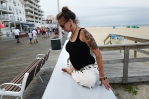 A young woman sits gracefully on a railing, embodying a moment of tranquility amidst the beachside bustle. Her tattoos and relaxed attire contrast against the lively background of the boardwalk, where passersby create a sense of community and energy. Soft, diffused lighting enhances the serene mood, wrapping her in a gentle embrace as she enjoys her solitary moment.