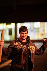 The photograph captures a young man standing confidently under dim streetlights, holding a rolled-up poster in one hand and making a fist with the other. The warm, blurred background hints at a bustling environment, contrasting with his focused expression, creating a sense of personal triumph amidst the evening's solitude.