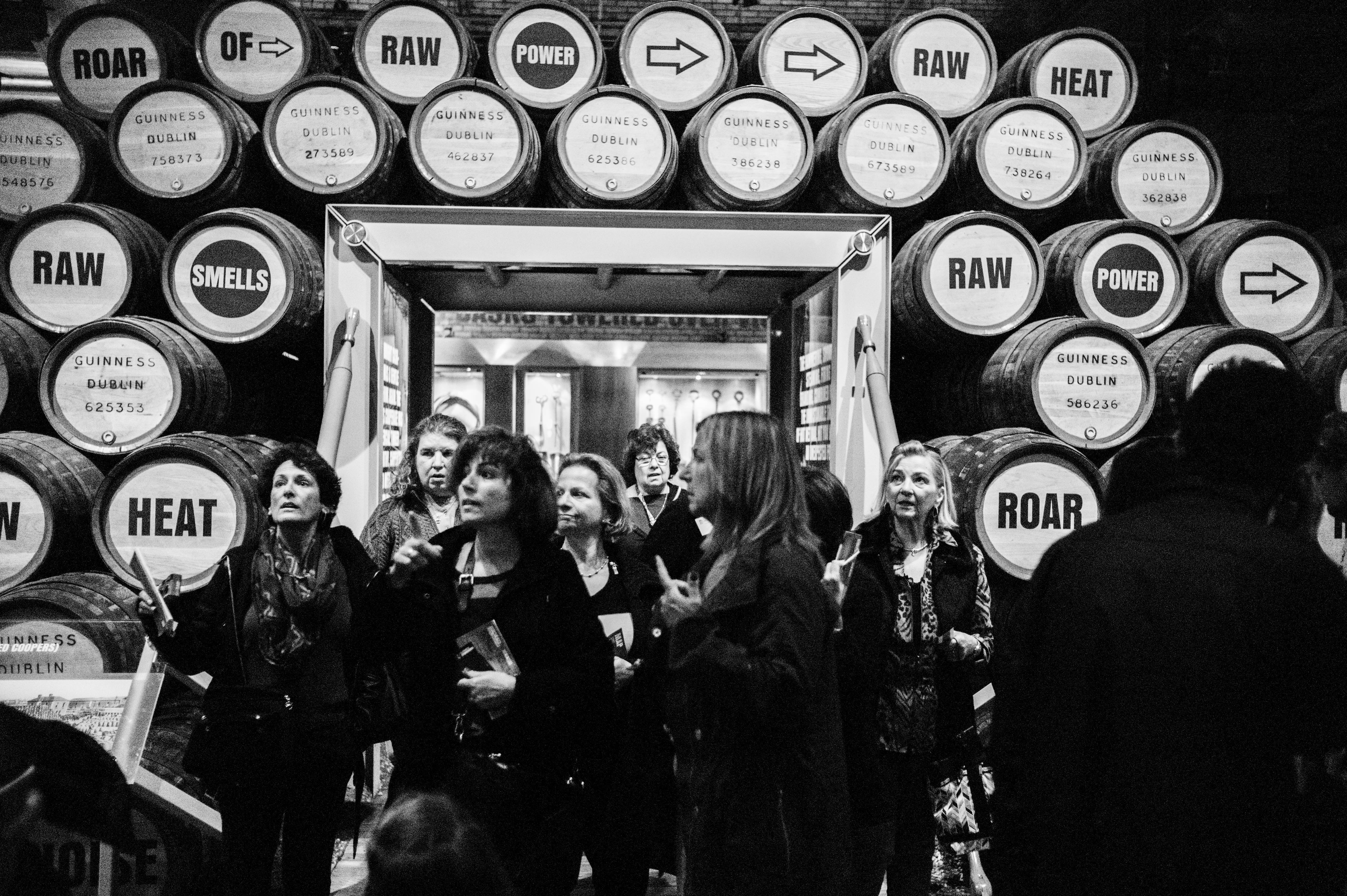 This black and white photograph captures a lively group of people standing in a dimly lit brewery, their expressions filled with curiosity and excitement. The backdrop of stacked barrels, adorned with bold words, adds a rustic charm and enhances the atmosphere of discovery amidst the brewing process. The interplay of shadows and light creates an inviting depth, drawing the viewer into this vibrant moment of shared experience.