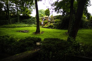 A gentle cascade tumbles over lush green rocks, creating a tranquil focal point in the verdant landscape. A figure dressed in white strolls thoughtfully along the edge, their presence blending harmoniously with the serene surroundings. Soft, diffused lighting envelops the scene, evoking a sense of calm and reflection amidst nature’s beauty.