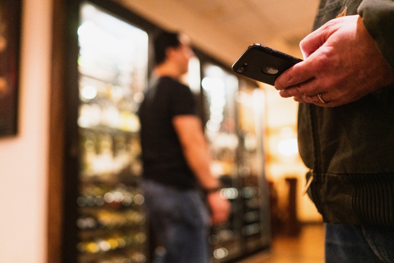 This intimate photograph captures a moment of solitude among a backdrop of bottles. A figure stands in the background, softly blurred, while the focus rests on a man holding a phone, suggesting a disconnect amid social surroundings. Warm, ambient lighting enhances the cozy yet contemplative mood of the scene.