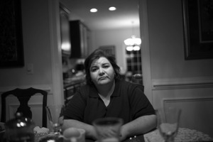In a softly lit dining space, a woman sits at a table surrounded by remnants of a meal, her expression reflecting a contemplative mood. The black-and-white composition enhances the intimacy and depth of the scene, drawing focus to her somber gaze and the textures of the setting. The dim ambient light juxtaposes with the bright kitchen in the background, creating a layered atmosphere of solitude amidst domestic life.