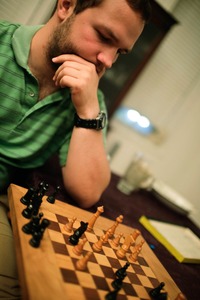 A focused young man deeply contemplates his next move in a chess match, surrounded by the warm glow of indoor lighting. The composition highlights the intricate arrangement of chess pieces, emphasizing the tension and strategy of the game. His thoughtful expression contrasts with the vibrant colors of the board, creating an atmosphere of quiet intensity and concentration.
