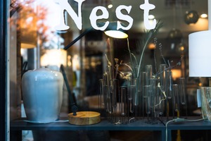 The photograph captures a cozy display behind a storefront window, featuring a gleaming white vase, a sculptural lamp, and an arrangement of slender glass tubes holding delicate plants. The warm glow from the lamps creates an inviting ambiance, while the soft reflections hint at a bustling urban life outside. The composition balances minimalism and warmth, suggesting a serene sanctuary amidst the city's vibrancy.