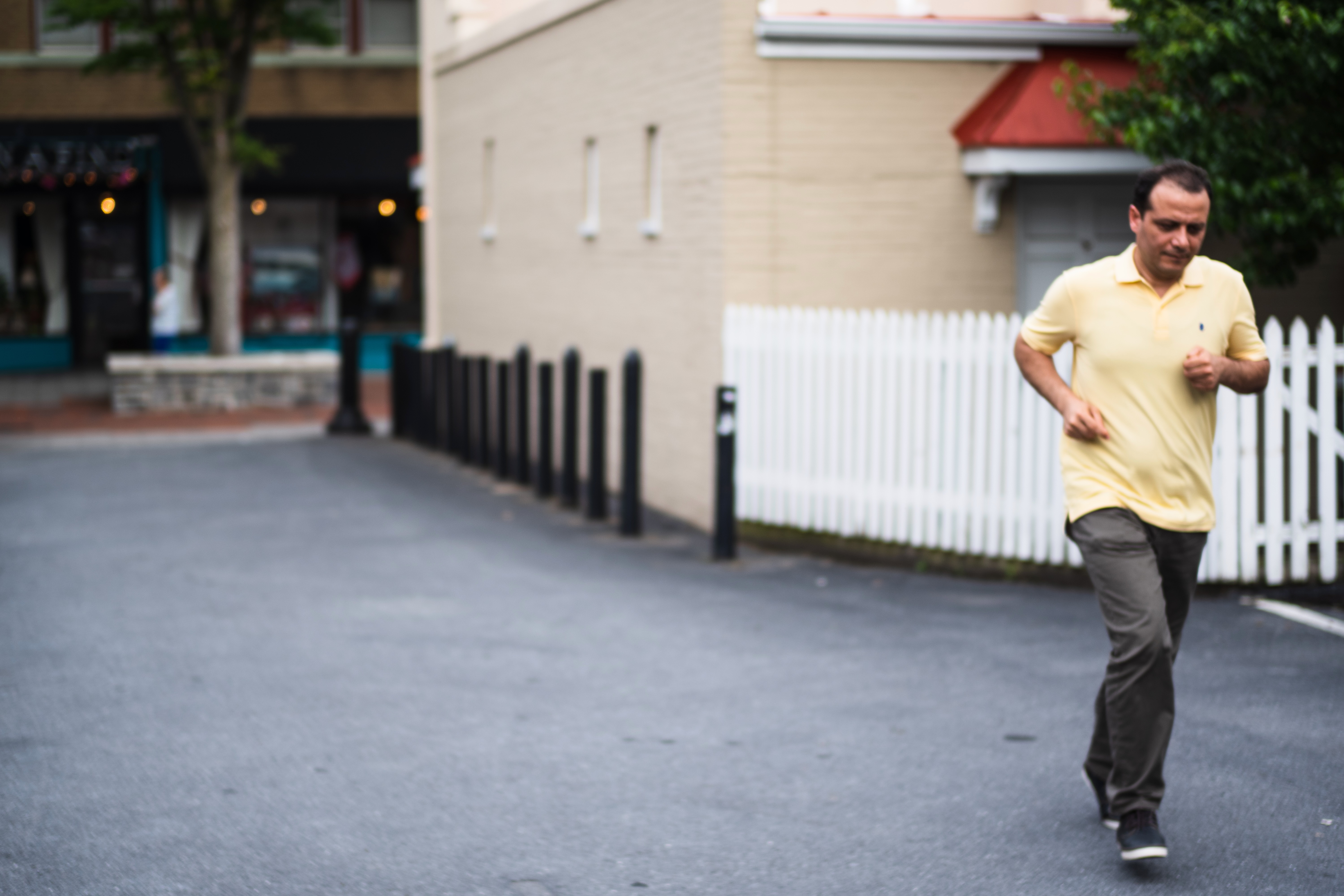 A lone man jogs down a quiet street, embodying a sense of determination and focus. The blurred background enhances the feeling of movement and energy, while soft, natural lighting creates a calm yet invigorating atmosphere. The contrasting colors of his pale yellow shirt against the muted surroundings draw the eye, emphasizing his solitary journey through the urban landscape.