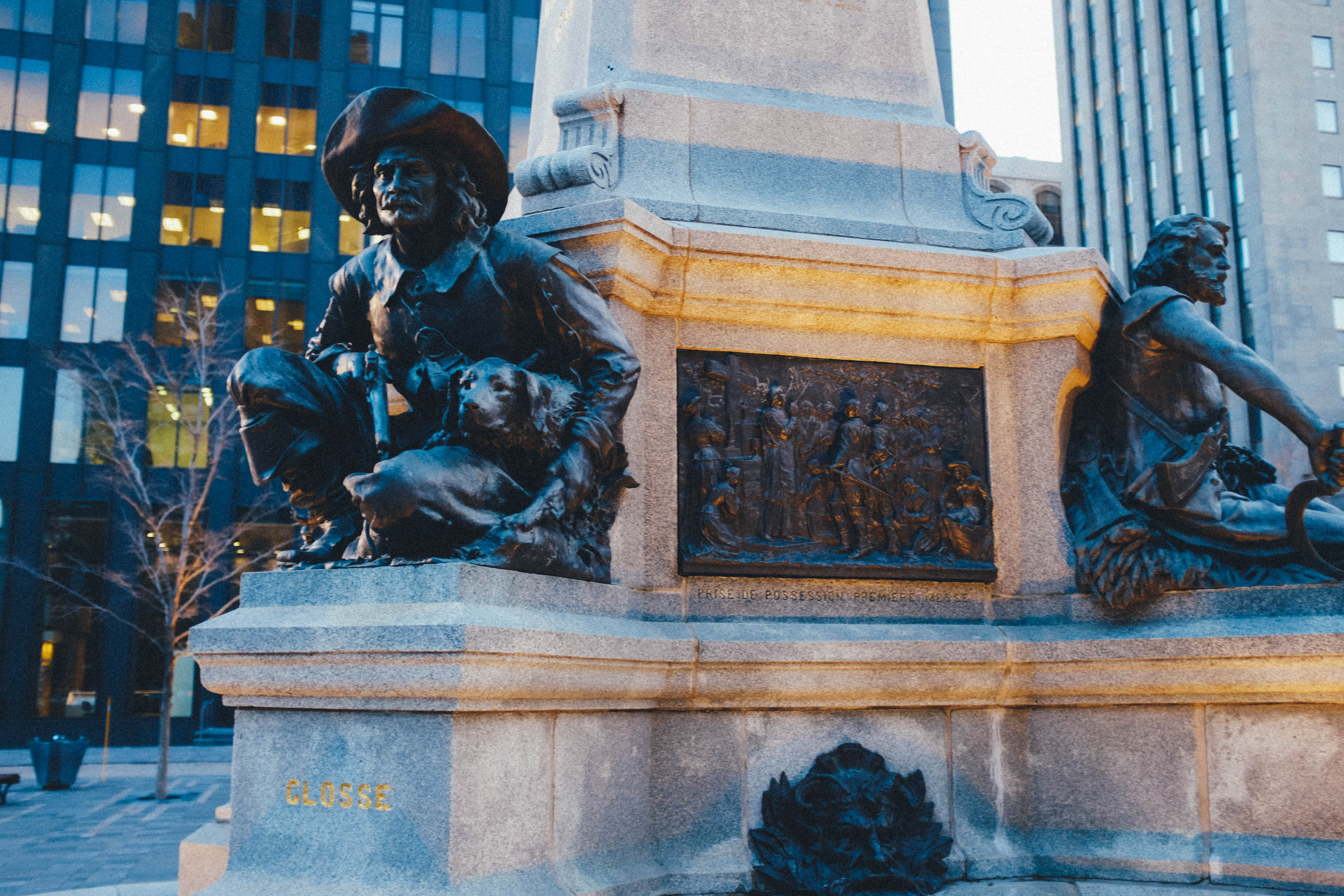 The photograph captures a detailed bronze statue, showcasing a young boy seated beside a dog, evoking a sense of innocence and companionship. The soft, cool light of dusk enhances the textures of the sculpture, creating a serene, almost nostalgic atmosphere against the backdrop of modern buildings. The composition invites viewers to reflect on the contrast between the timelessness of the artwork and the bustling city life around it.