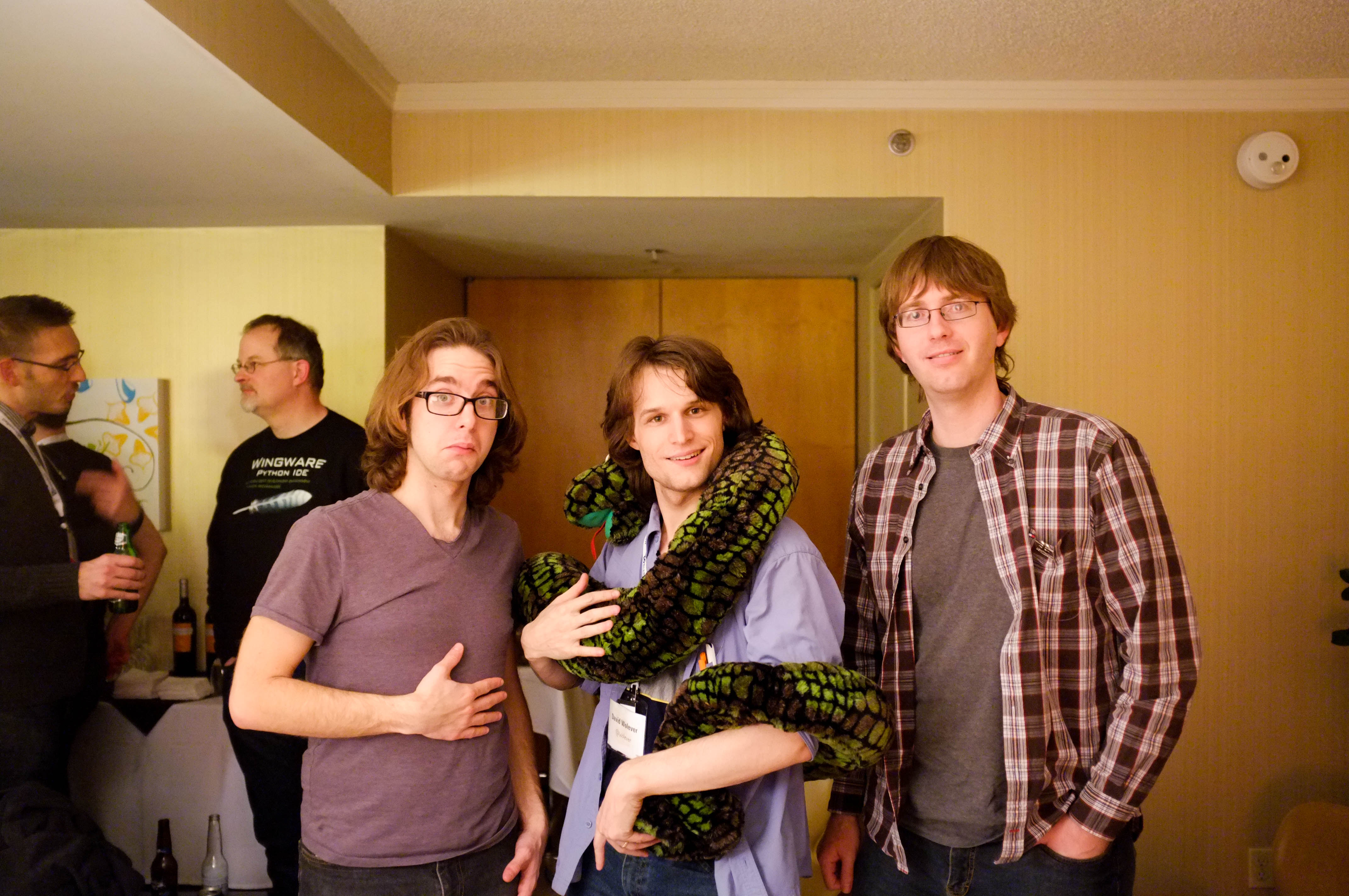 In a relaxed indoor setting, three friends pose together, one cradling a vibrant, green snake, creating an intriguing focal point. The soft lighting highlights their expressions of surprise and amusement, conveying a carefree atmosphere. The backdrop hints at a casual gathering, adding to the friendly vibe of the moment.