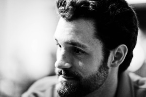 The photograph captures a close-up of a man in profile, immersed in thought, with soft lighting that highlights his facial contours and rich beard. The monochrome palette adds a timeless quality, evoking introspection and depth, while blurred background elements enhance the subject's contemplative mood. His gentle expression invites the viewer to ponder what lies behind his gaze.