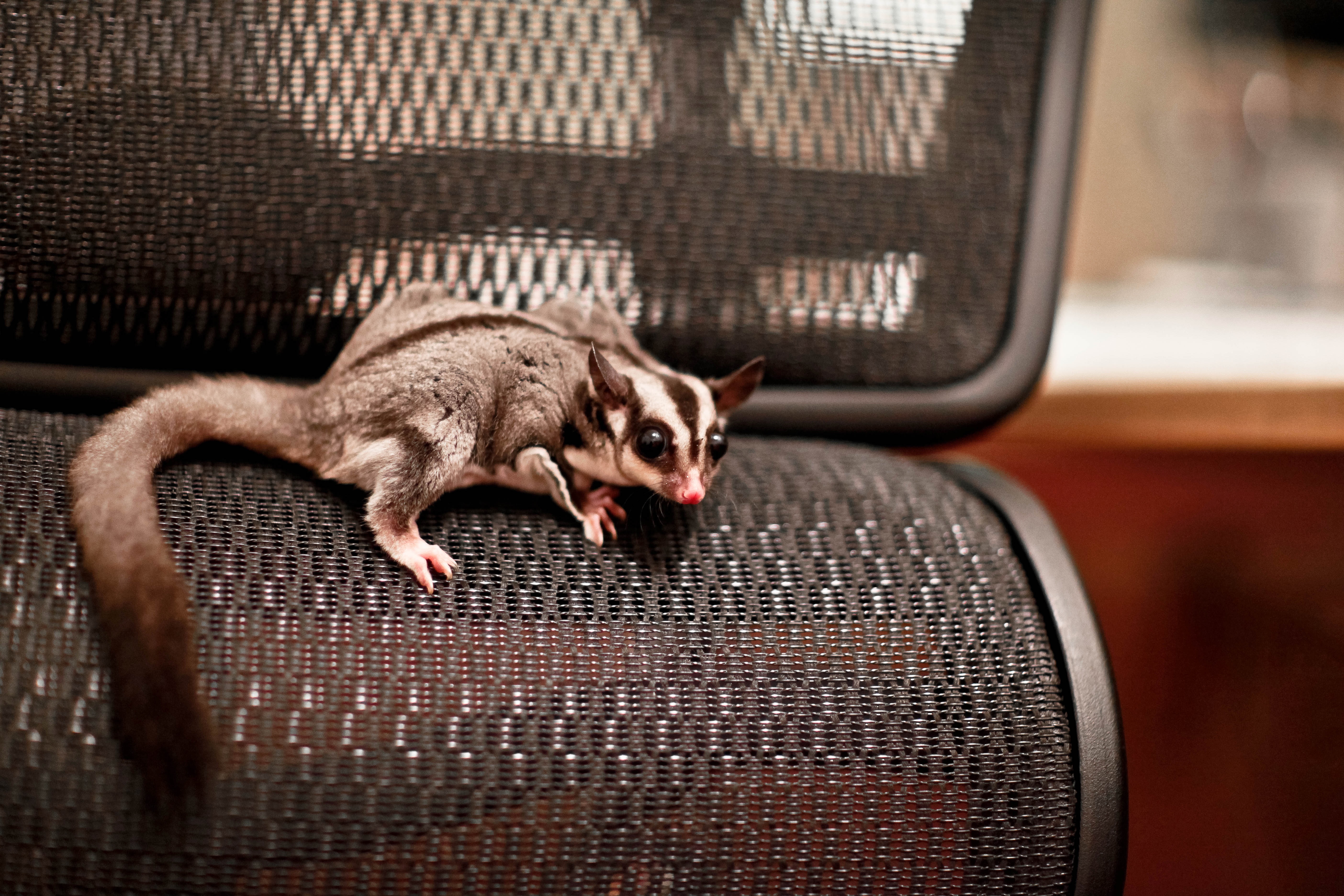 A curious sugar glider teeters on the edge of a modern office chair, its small body and large expressive eyes capturing a moment of playful exploration. The soft lighting emphasizes its delicate fur and the intricate mesh of the chair, creating a cozy yet dynamic atmosphere. The composition draws the viewer's eye to the glider's inquisitive posture, adding a sense of whimsy and charm to the scene.