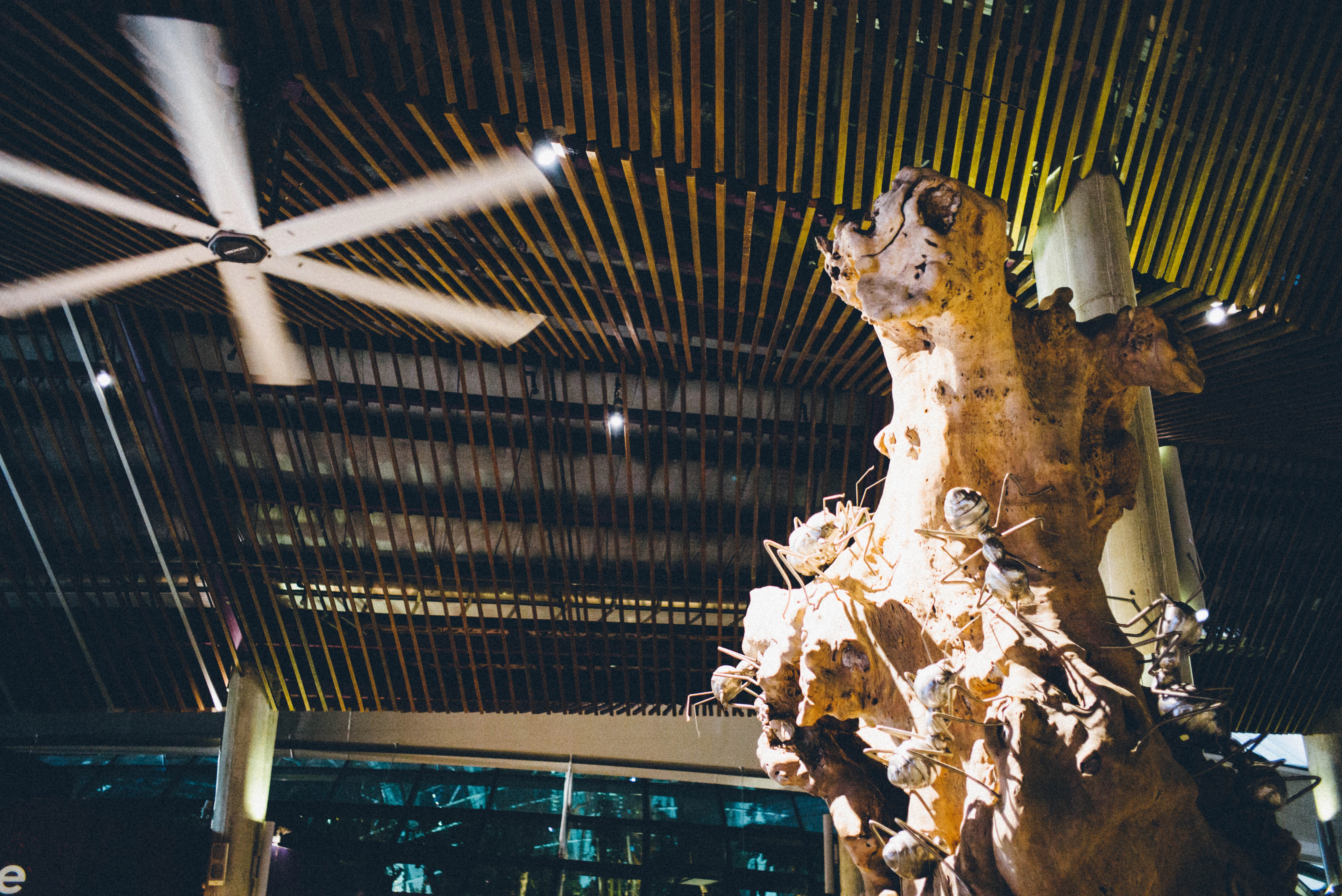 This photograph captures a striking vision of a sculptural tree trunk, elegantly anchored beneath a ceiling adorned with wooden slats and industrial lighting. The swirling motion of the ceiling fan above contrasts with the organic forms of the tree, creating a dynamic interplay between nature and contemporary design. Soft, ambient lighting enhances the natural textures, evoking a sense of calm and introspection in a modern space.