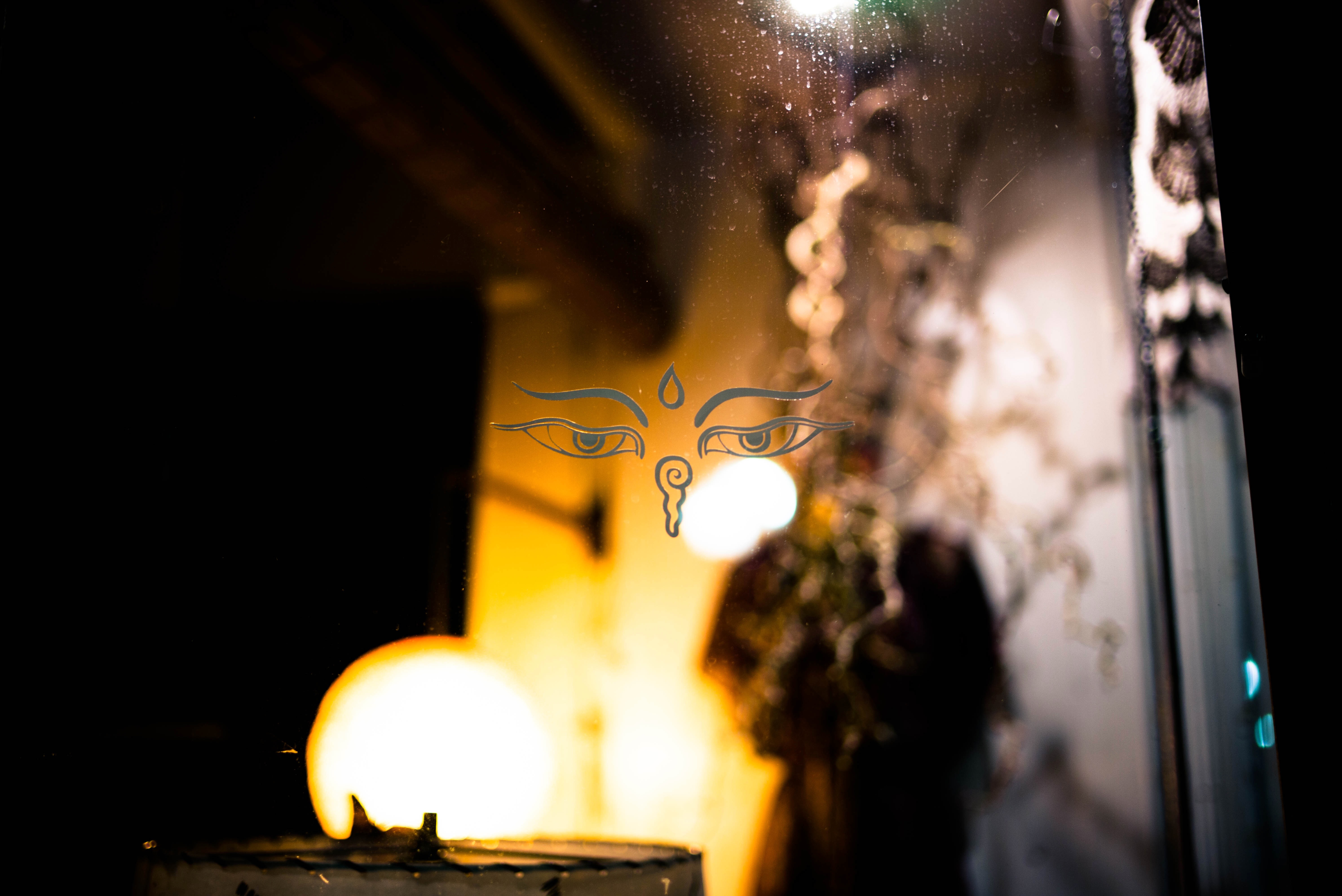 The photograph captures a serene moment through a reflective surface, showcasing a delicate balance of light and shadow. The warm glow from a softly illuminated orb contrasts with the dark background, while intricate patterns hint at tranquility and contemplation. The ethereal gaze emblazoned on the glass adds a mystical quality, inviting the viewer to reflect and engage with the mood.