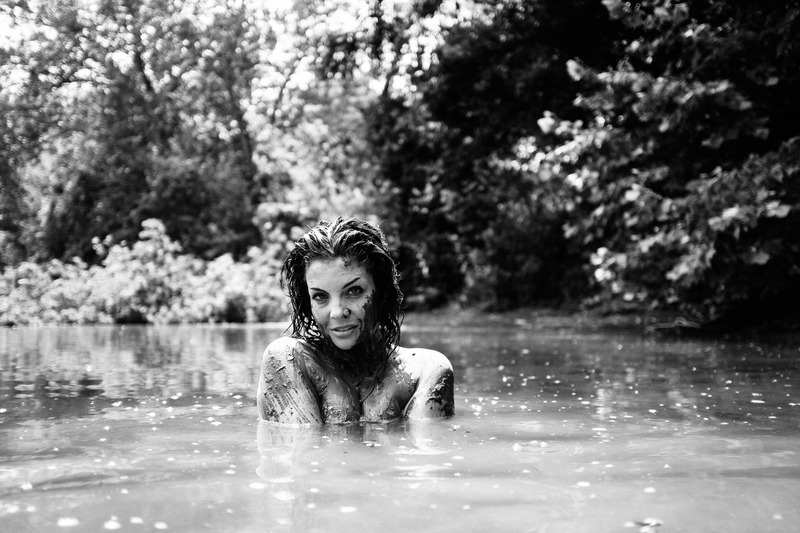 The photograph captures a woman partially submerged in a serene, muddy water, exuding a sense of raw beauty and vulnerability. Her expressive gaze, framed by wet, tousled hair, invites the viewer to connect with her amidst the lush greenery, creating a mood that is both haunting and intimate. The black-and-white composition enhances the contrasts, emphasizing the textures of her skin and the surrounding nature, while the soft lighting infuses the scene with an ethereal quality.