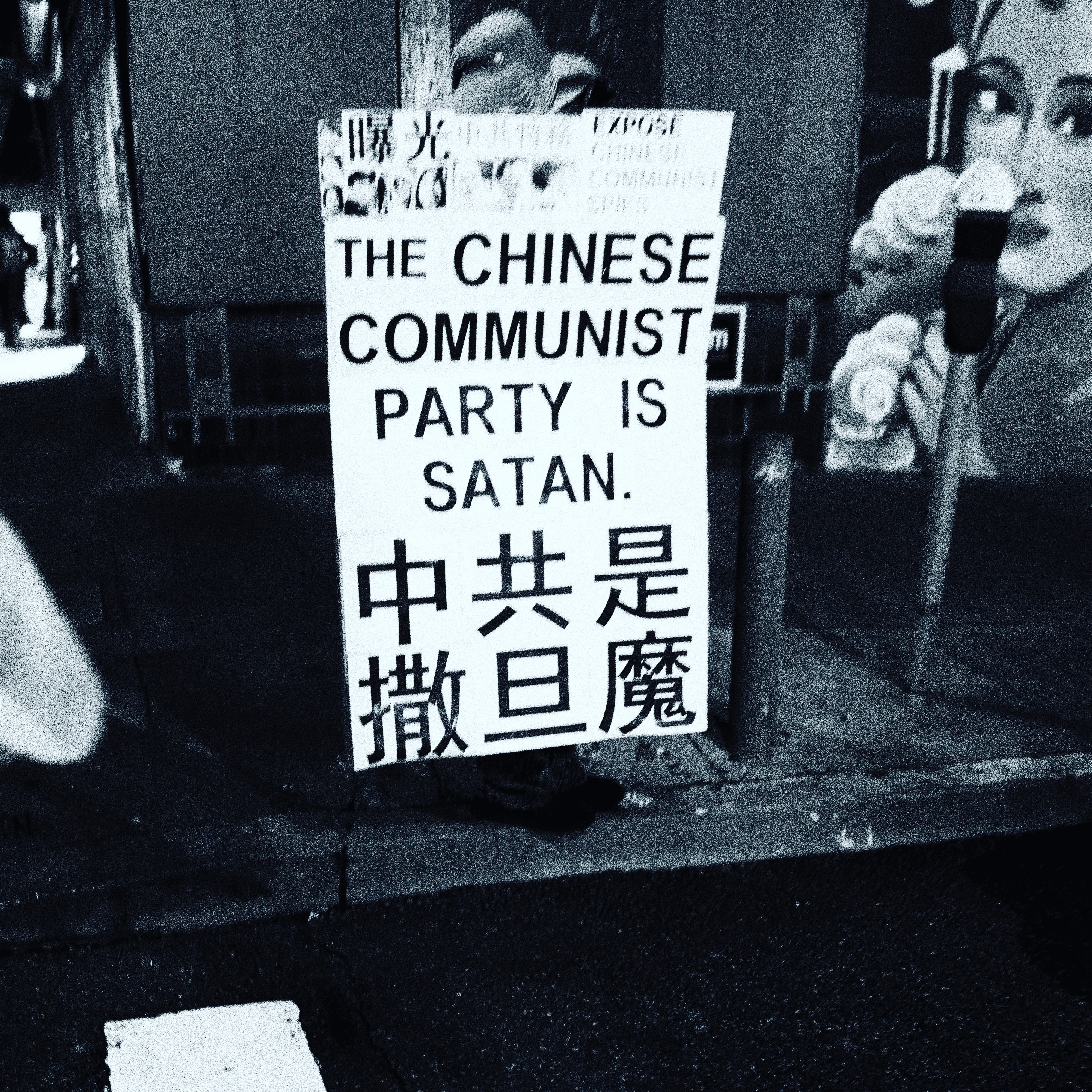 In a dimly lit urban setting, a stark white sign boldly declares a politically charged message, contrasting sharply against the dark surroundings. The mood is charged with tension, underscored by the gritty black-and-white composition. A single light source highlights the sign's urgency, while subtle hints of vibrant colors in the background suggest a lively city at odds with the weighty sentiment expressed.