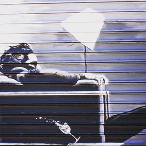 This photograph captures a monochromatic mural depicting a figure reclined on a couch, illuminated by a stark lamp overhead. The interplay of light and shadow establishes a contemplative mood, evoking a sense of relaxation and introspection. Vertical lines of the shutter create an intriguing texture, enhancing the artwork's dramatic composition.