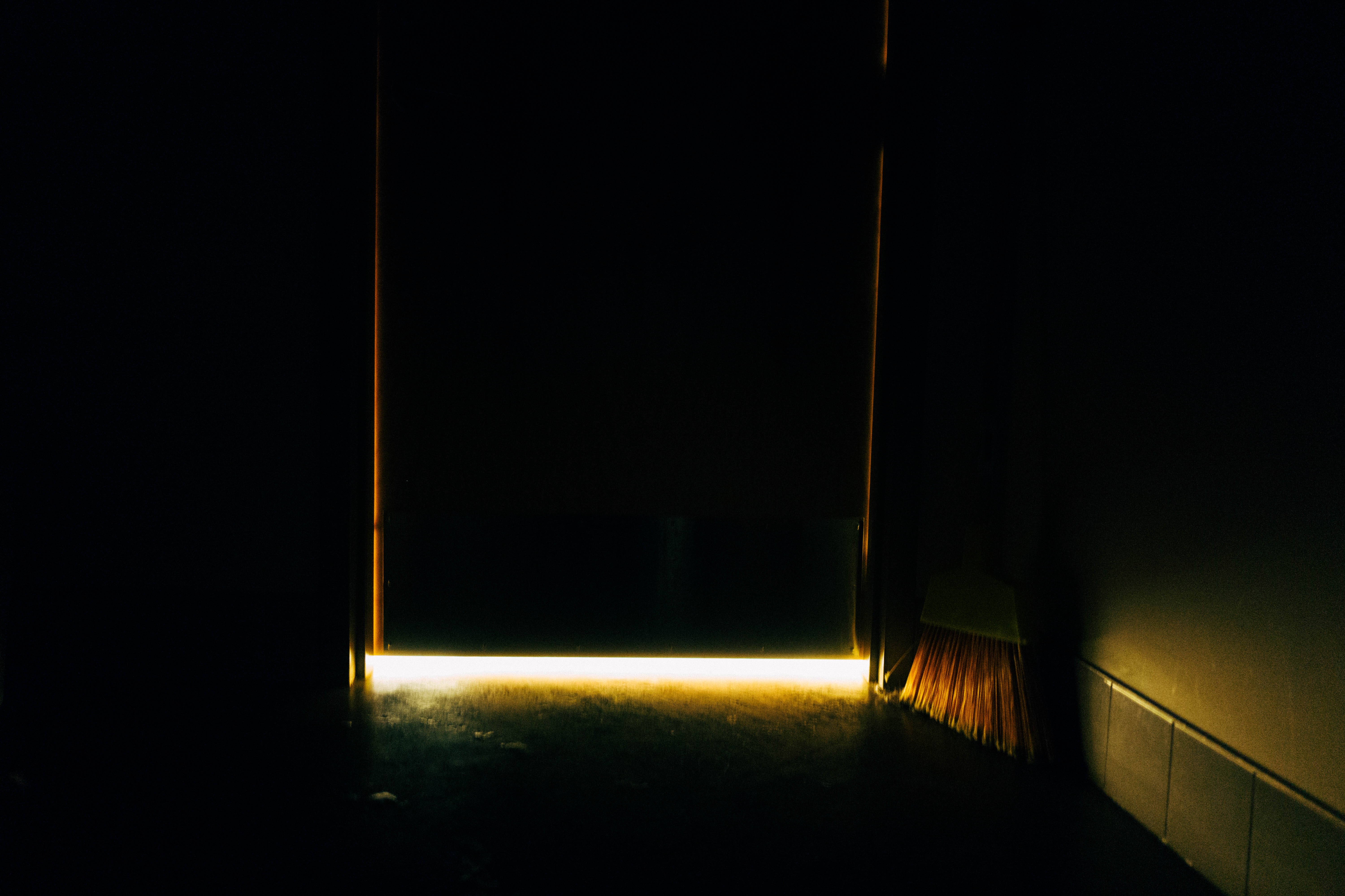 A dimly lit scene captures the edge of a door slightly ajar, emitting a warm, golden glow that contrasts sharply with the surrounding darkness. The silhouette of a broom stands quietly in the corner, adding a sense of stillness and quietude to the mood. This composition evokes a feeling of mystery, inviting contemplation about what lies beyond the illuminated threshold.