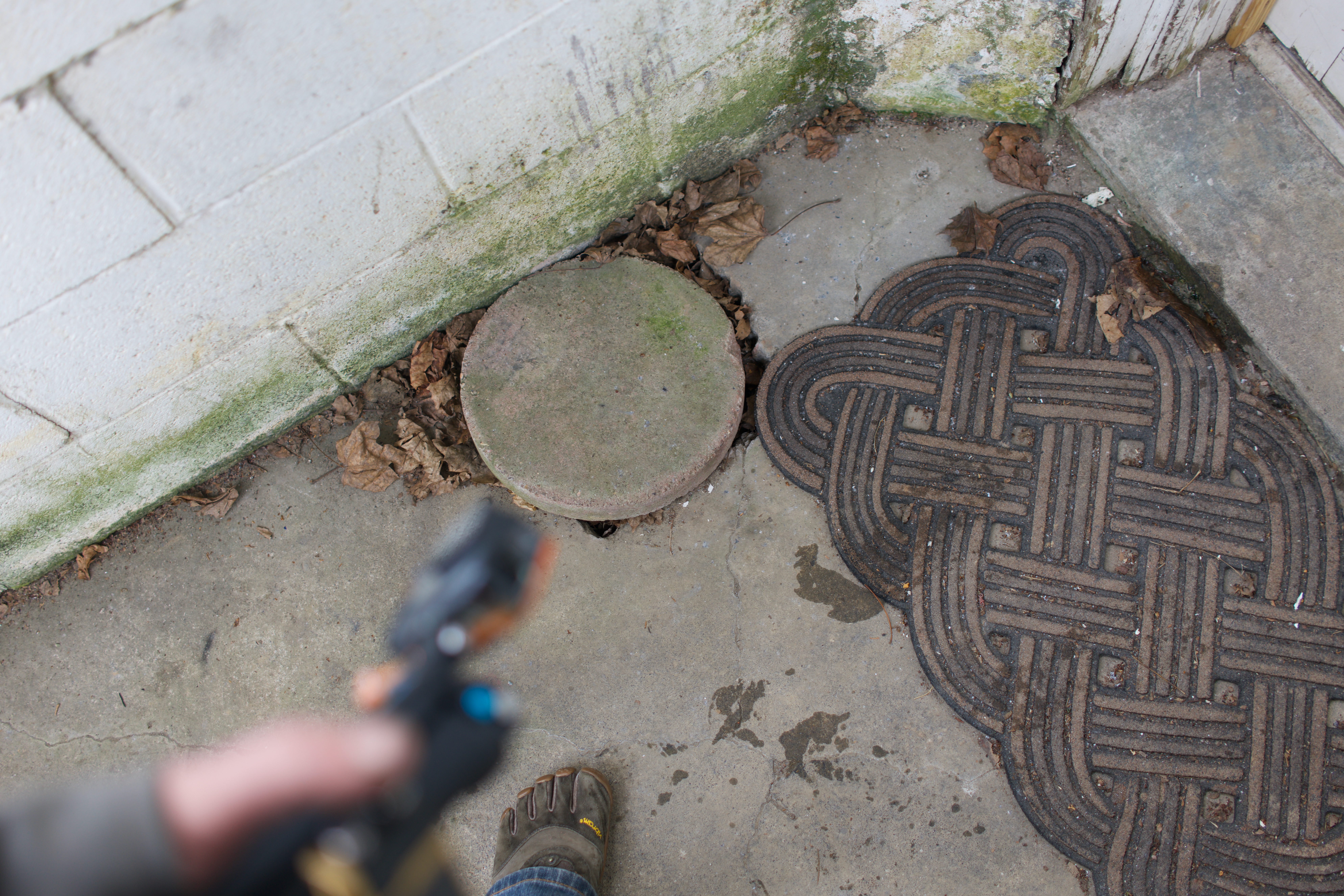 The photograph captures a neglected outdoor corner, featuring a circular stone and an intricately patterned doormat. The muted colors and scattered leaves evoke a sense of stillness and decay, while the upward angle suggests a feeling of introspection. The soft, diffused light enhances the somber mood, inviting the viewer to contemplate the passage of time and unnoticed details.