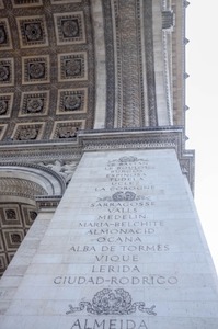 This photograph captures the intricate details of a grand archway, showcasing the delicate ornamental design above and the engraved names on the pillar below. The upward angle creates a dramatic perspective, enhancing the sense of majesty and historical significance, while soft natural light accentuates the stone's texture. The overall mood is one of reverence, inviting the viewer to appreciate the craftsmanship and stories embodied in the architecture.
