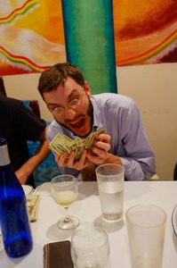 In a vibrant setting adorned with colorful artwork, a man exuberantly clutches a handful of cash, his expression a mix of delight and surprise. The warm ambient light adds to the lively atmosphere, highlighting the excitement as he revels in the moment. Surrounding him are glasses and bottles, hinting at a celebratory occasion filled with laughter and camaraderie.