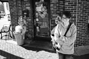 In this black-and-white photograph, a young woman stands casually outside a quaint brick storefront, exuding a sense of warmth and approachability. The play of light and shadow on the textured ground and the soft smile on her face create an inviting atmosphere, while the heart-shaped decoration in the window hints at the charm of the surroundings. Her camera suggests a moment of spontaneity, capturing life’s little joys in a bustling yet intimate setting.