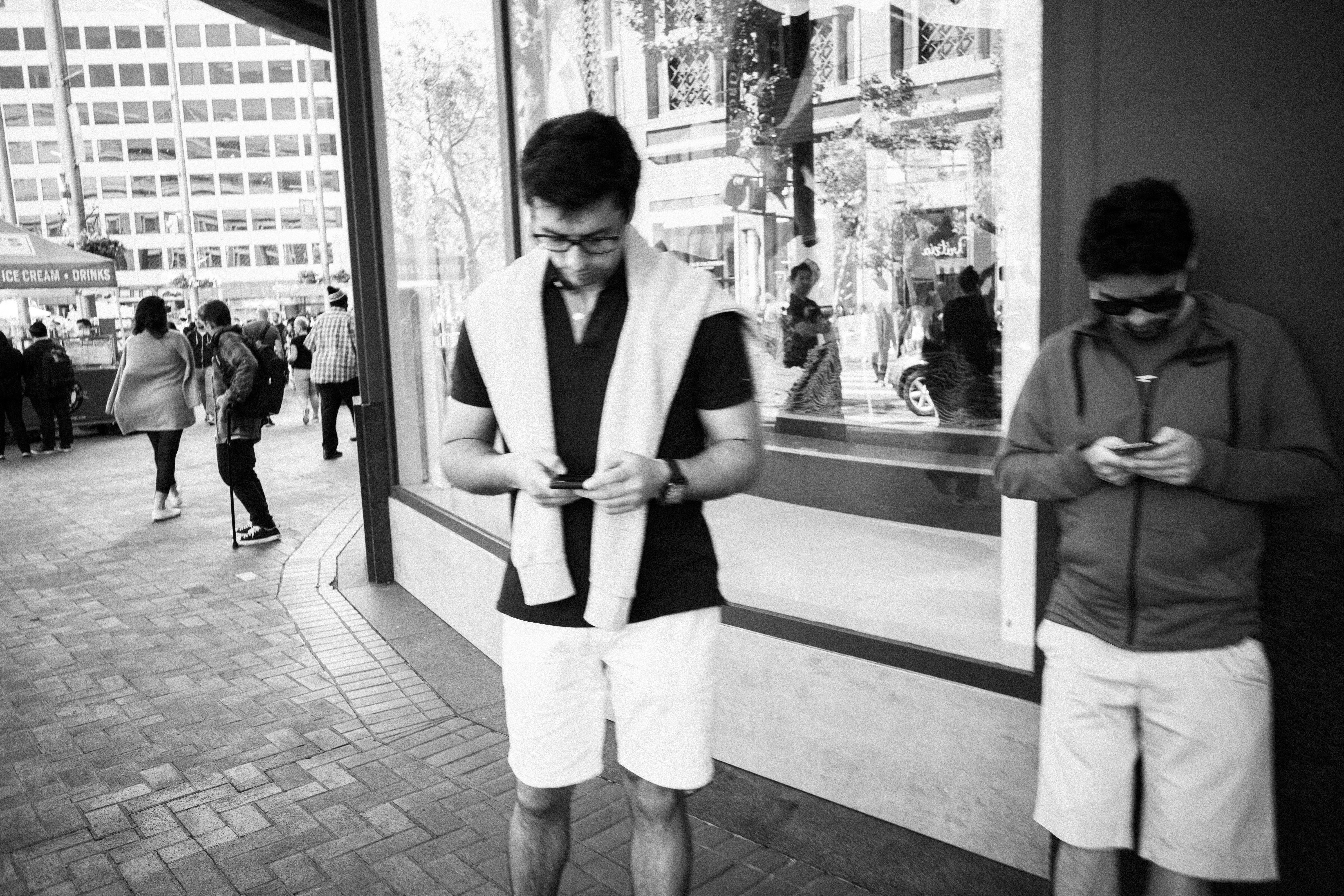 In a bustling urban scene, two young men stand side by side, absorbed in their smartphones, embodying a moment of disconnection amidst the surrounding life. The stark black and white composition emphasizes their isolation, contrasting sharply with the dynamic backdrop of pedestrians and storefront reflections. Soft natural light contrasts with the shadowy spaces, adding a contemplative mood to this slice of modern life.