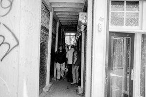 In a narrow alleyway, a group of individuals congregates, creating a sense of camaraderie against the urban backdrop. The black and white composition emphasizes the contrasts of light and shadow, evoking a mood of introspection and quiet conversation. Graffiti on the walls adds character, suggesting the vibrancy of city life amidst a quiet, almost intimate setting.