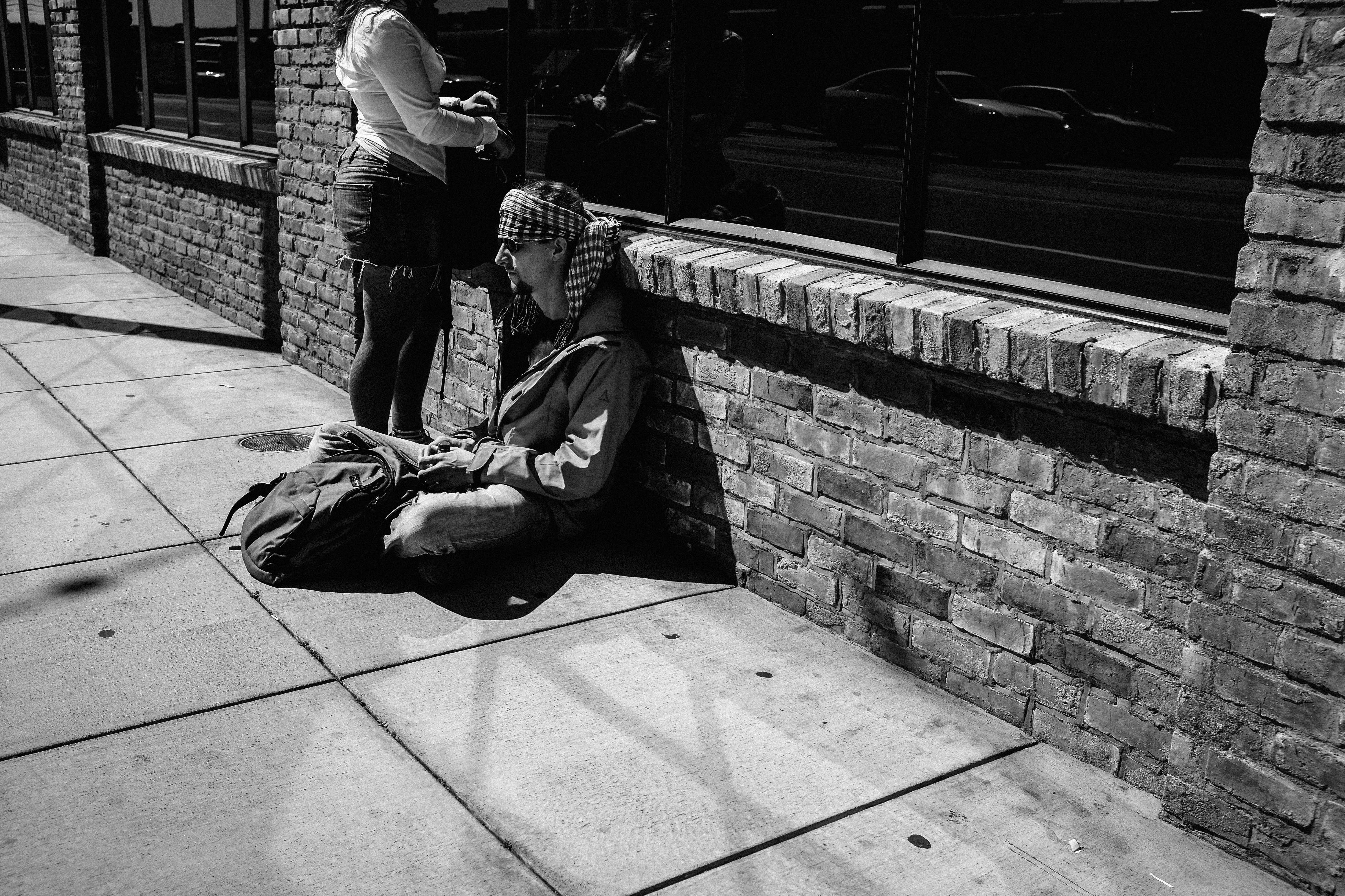 In this striking black-and-white image, a man sits against a brick wall, embodying a moment of stillness amid a bustling environment. The contrasting light and shadows create a somber yet contemplative mood, highlighting his isolation while a passerby tends to something just out of view. The composition draws the eye along the linear elements of the sidewalk and wall, emphasizing the divide between the two figures.
