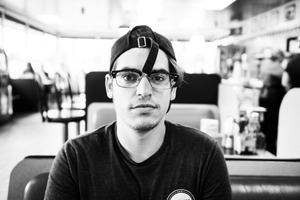 This black-and-white photograph captures a young man seated in a diner, his expression contemplative yet slightly playful with a cap strap draped over his forehead. The atmosphere is an intriguing mix of casual comfort and introspection, enhanced by soft natural lighting filtering through the large windows behind him. The blurred background, filled with patrons and diner decor, contrasts with the sharp focus on his face, highlighting his subdued yet engaging presence.